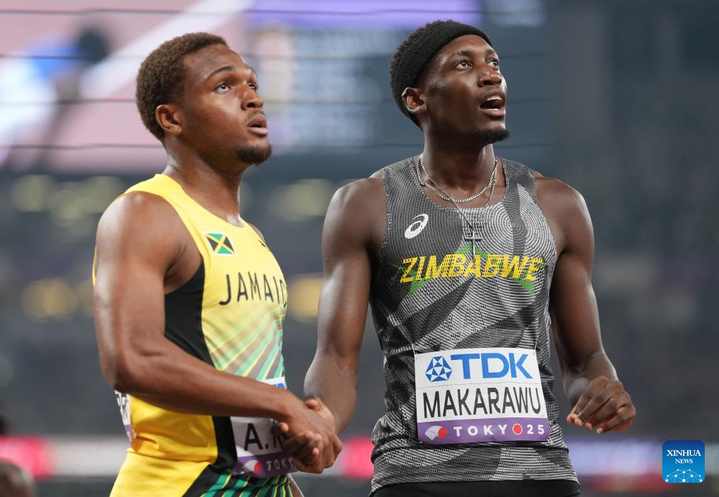 TOKIO, 17 septiembre, 2025 (Xinhua) -- Adrian Kerr (i), de Jamaica, y Tapiwanashe Makarawu, de Zimbabue, son vistos al término de las eliminatorias de 200m masculinos, en el Campeonato Mundial de Atletismo de 2025, en Tokio, Japón, el 17 de septiembre de 2025. (Xinhua/Jiang Han)