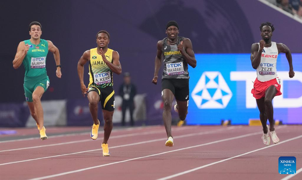TOKIO, 17 septiembre, 2025 (Xinhua) -- (De izq. a der.) Aidan Murphy, de Australia, Adrian Kerr, de Jamaica, Tapiwanashe Makarawu, de Zimbabue, y Ryan Zeze, de Francia, compiten durante las eliminatorias de 200m masculinos, en el Campeonato Mundial de Atletismo de 2025, en Tokio, Japón, el 17 de septiembre de 2025. (Xinhua/Jiang Han)