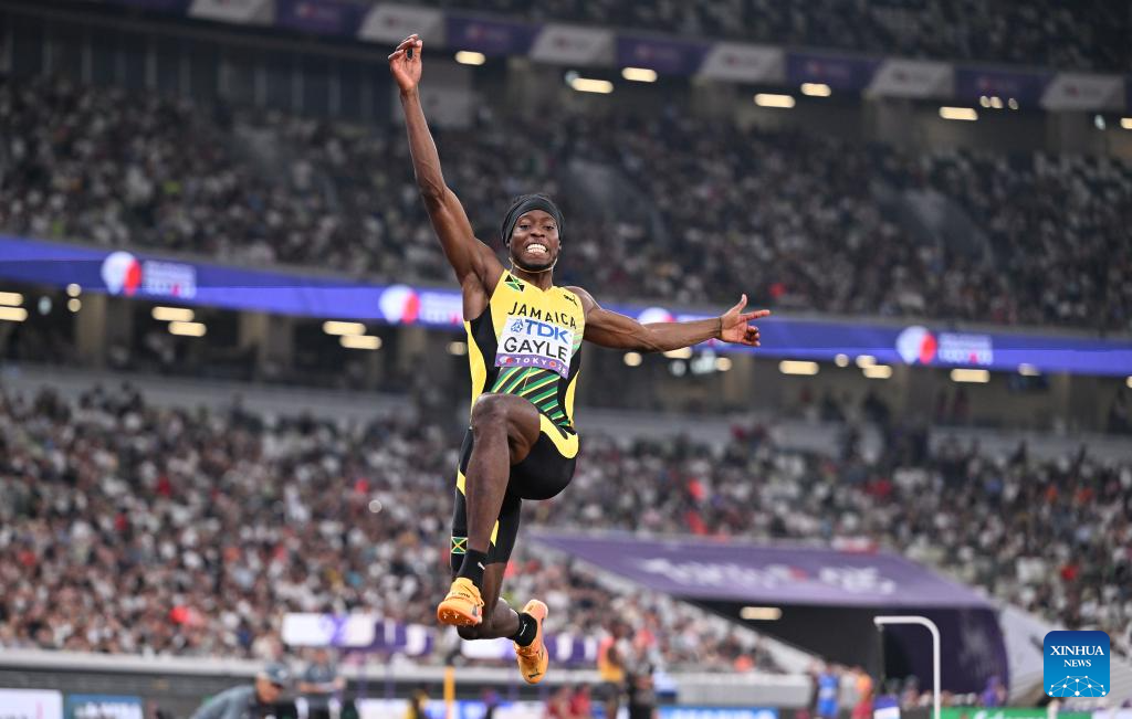 TOKIO, 17 septiembre, 2025 (Xinhua) -- Tajay Gayle, de Jamaica, compite durante la final de salto de longitud masculino, en el Campeonato Mundial de Atletismo de 2025, en Tokio, Japón, el 17 de septiembre de 2025. (Xinhua/Song Yanhua)
