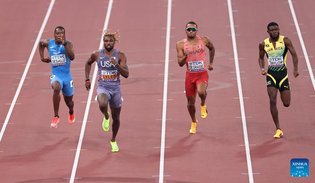 TOKIO, 17 septiembre, 2025 (Xinhua) -- (De izq. a der.) Eseosa Fostine Desalu, de Italia, Noah Lyles, de Estados Unidos, Andre De Grasse, de Canadá, y Christopher Taylor, de Jamaica, compiten durante las eliminatorias de 200m masculinos en el Campeonato Mundial de Atletismo de 2025, en Tokio, Japón, el 17 de septiembre de 2025. (Xinhua/Jia Haocheng)