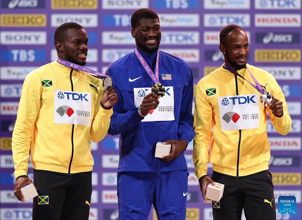 TOKIO, 17 septiembre, 2025 (Xinhua) -- El medallista de oro, Cordell Tinch (c), de Estados Unidos, el medallista de plata, Orlando Bennett (i), de Jamaica, y el medallista de bronce, Tyler Mason, de Jamaica, posan durante la ceremonia de premiación de 110m con vallas masculinos en el Campeonato Mundial de Atletismo de 2025, en Tokio, Japón, el 17 de septiembre de 2025. (Xinhua/Jia Haocheng)