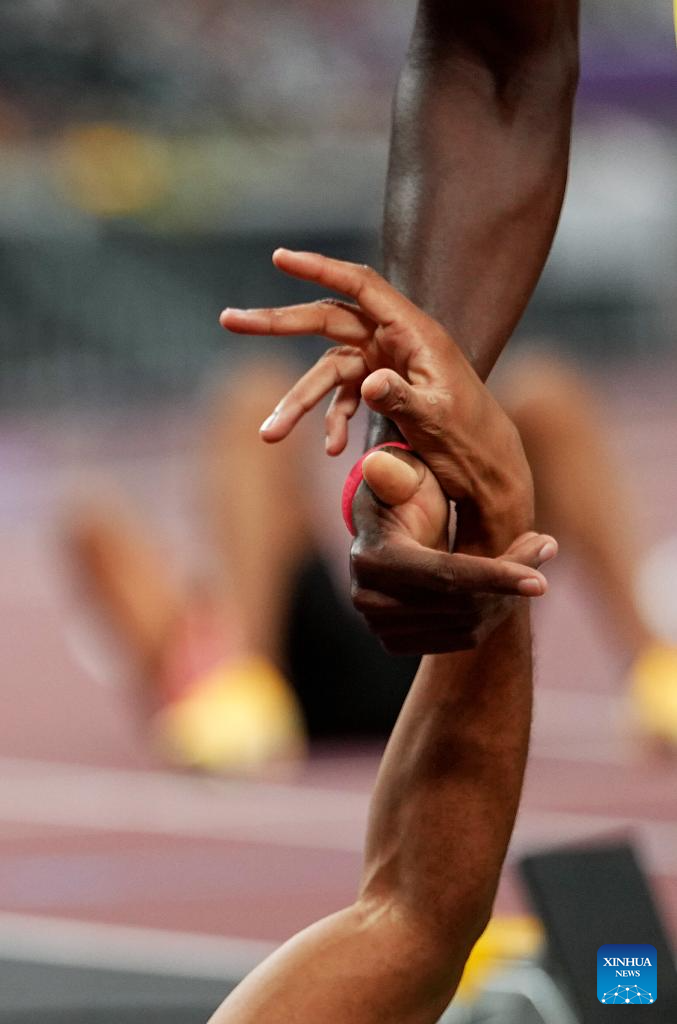 TOKIO, 17 septiembre, 2025 (Xinhua) -- Imagen del 16 de septiembre de 2025 del medallista de plata, Orlando Bennett (i), de Jamaica, reaccionando mientras el medallista de oro, Cordell Tinch (c), de Estados Unidos, concede una entrevista al término de la final de 110m con vallas masculinos, en el Campeonato Mundial de Atletismo de 2025, en Tokio, Japón. (Xinhua/Ju Huanzong)