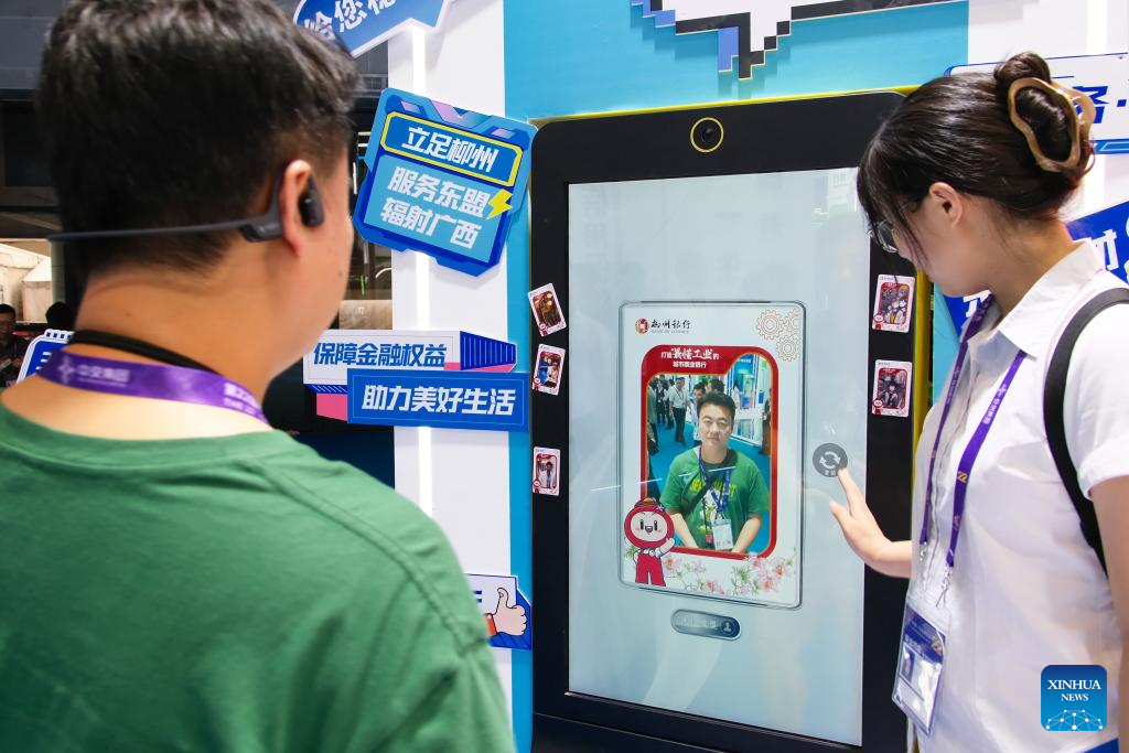 NANNING, 17 septiembre, 2025 (Xinhua) -- Un visitante prueba una instalación de intercambio de rostros basada en inteligencia artificial en el Centro Internacional de Convenciones y Exposiciones de Nanning, en Nanning, en la región autónoma de la etnia zhuang de Guangxi, en el sur de China, el 17 de septiembre de 2025. La 22ª Exposición China-ASEAN y a la Cumbre de Negocios e Inversiones China-ASEAN comenzaron aquí el miércoles. (Xinhua/Hu Qiusi)