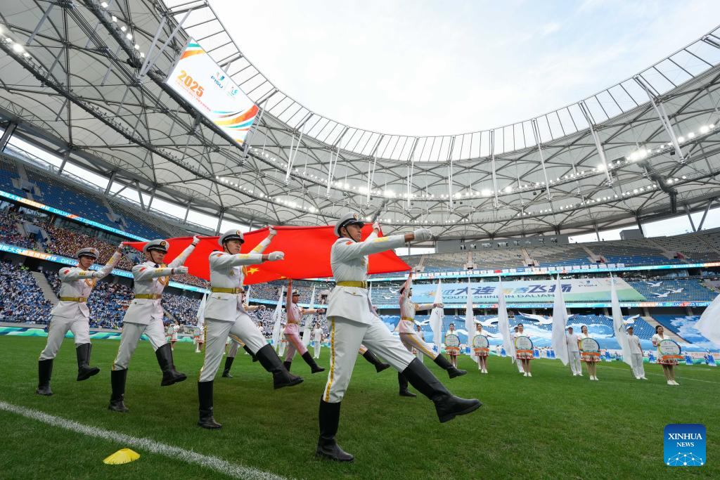 DALIAN, 17 septiembre, 2025 (Xinhua) -- La bandera nacional china es llevada durante la ceremonia de inauguración de la Copa Mundial Universitaria de Fútbol de la FISU 2025 celebrada en el Estadio Suoyuwan, en Dalian, en la provincia de Liaoning, en el noreste de China, el 17 de septiembre de 2025. (Xinhua/Zheng Huansong)