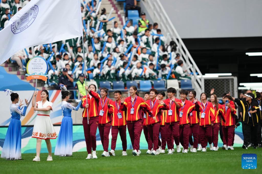DALIAN, 17 septiembre, 2025 (Xinhua) -- La delegación de la Universidad Normal de Beijing de China, desfila durante la ceremonia de inauguración de la Copa Mundial Universitaria de Fútbol de la FISU 2025 celebrada en el Estadio Suoyuwan, en Dalian, en la provincia de Liaoning, en el noreste de China, el 17 de septiembre de 2025. (Xinhua/Zheng Huansong)
