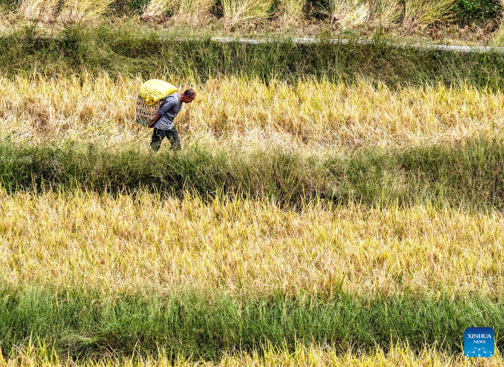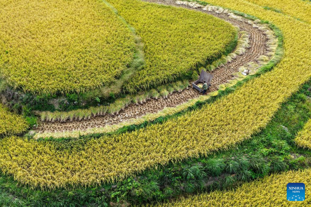 CHONGQING, 18 septiembre, 2025 (Xinhua) -- Imagen tomada con un dron el 18 de septiembre de 2025 de un agricultor transportando cosechas en un campo aterrazado, en el poblado de Wuli, en el distrito de Qianjiang, en la municipalidad de Chongqing, en el suroeste de China. El poblado de Wuli de Chongqing, que alberga aproximadamente 5.300 mu (cerca de 353,33 hectáreas) de arrozales, recientemente ha entrado a la temporada de cosecha de arroz. (Xinhua/Tang Yi)