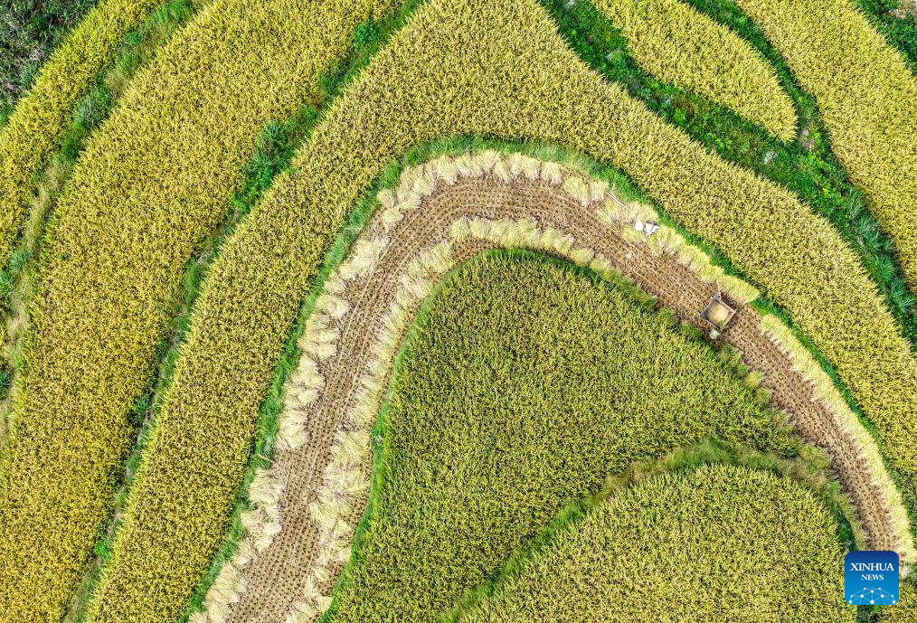 CHONGQING, 18 septiembre, 2025 (Xinhua) -- Vista aérea tomada con un dron el 18 de septiembre de 2025 de campos aterrazados, en el poblado de Wuli, en el distrito de Qianjiang, en la municipalidad de Chongqing, en el suroeste de China. El poblado de Wuli de Chongqing, que alberga aproximadamente 5.300 mu (cerca de 353,33 hectáreas) de arrozales, recientemente ha entrado a la temporada de cosecha de arroz. (Xinhua/Tang Yi)