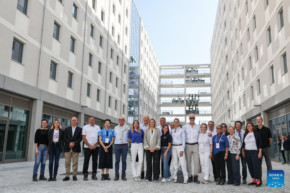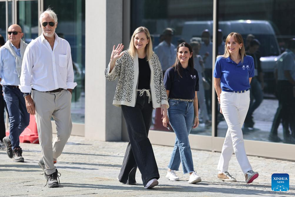 MILAN, 18, 2025 (Xinhua) -- La presidenta del COI, Kirsty Coventry (2-i), reacciona durante su visita a la Villa Olímpica y Paralímpica de Milán Cortina 2026, en Milán, Italia, el 18 de septiembre de 2025. (Xinhua/Li Jing)