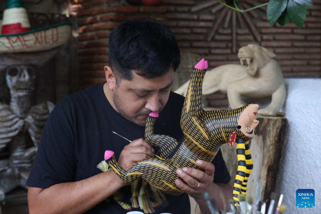 OAXACA, 18 septiembre, 2025 (Xinhua) -- Imagen del 16 de septiembre de 2025 de un artesano pintando un tallado de madera animales fantásticos en un taller, en San Antonio Arrazola, en el estado de Oaxaca, México. El pueblo de San Antonio Arrazola, en las afueras de la ciudad de Oaxaca es famoso por sus coloridos tallados de madera animales fantásticos. Los tallados de madera animales fantásticos suelen inspirarse en animales, impregnados de elementos fantásticos y mitológicos. Esta artesanía no solo es un arte popular local emblemático, sino también una fuente vital de ingresos para muchas familias locales. (Xinhua/Li Mengxin)