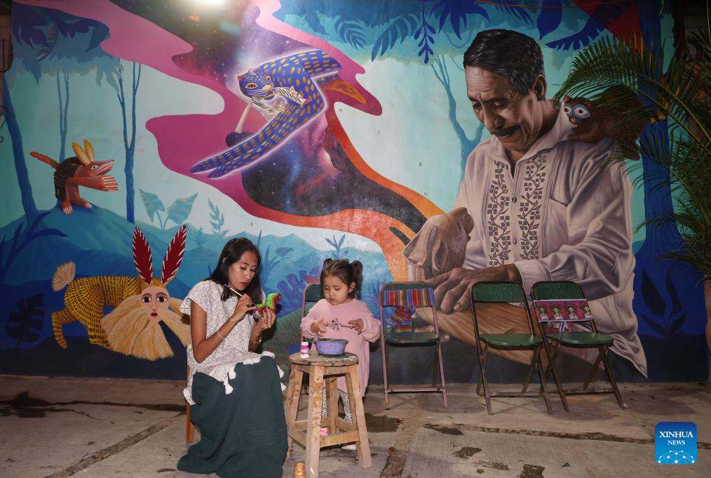 OAXACA, 18 septiembre, 2025 (Xinhua) -- Imagen del 16 de septiembre de 2025 de una artesana y su hija pintando un tallado de madera animales fantásticos en un taller, en San Antonio Arrazola, en el estado de Oaxaca, México. El pueblo de San Antonio Arrazola, en las afueras de la ciudad de Oaxaca es famoso por sus coloridos tallados de madera animales fantásticos. Los tallados de madera animales fantásticos suelen inspirarse en animales, impregnados de elementos fantásticos y mitológicos. Esta artesanía no solo es un arte popular local emblemático, sino también una fuente vital de ingresos para muchas familias locales. (Xinhua/Li Mengxin)
