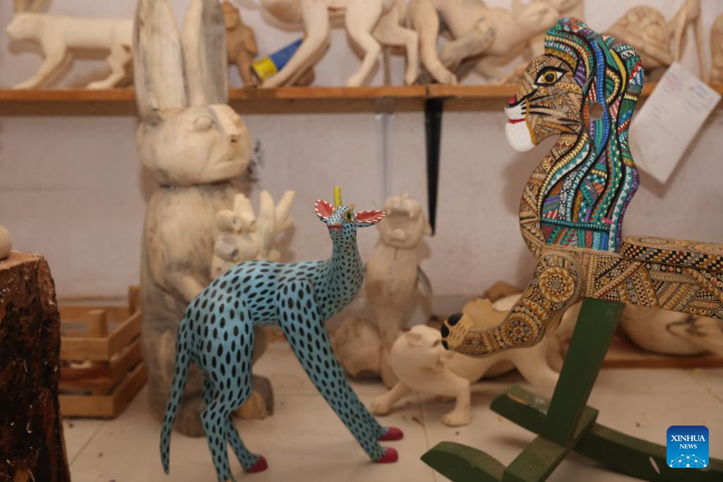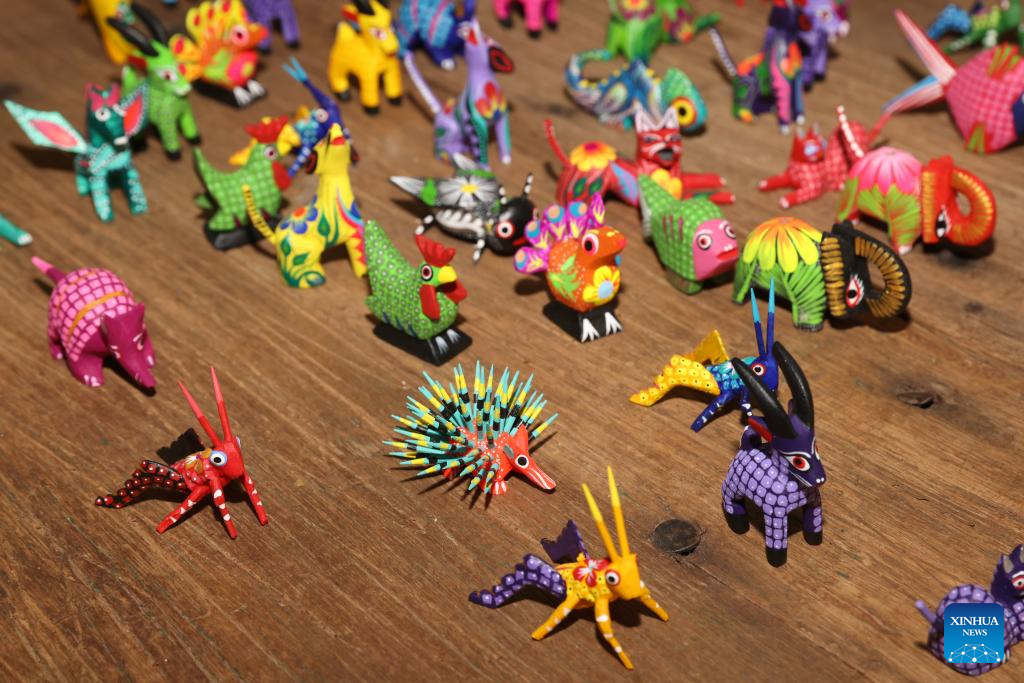 OAXACA, 18 septiembre, 2025 (Xinhua) -- Imagen del 16 de septiembre de 2025 de tallados de madera animales fantásticos vistos en un taller, en San Antonio Arrazola, en el estado de Oaxaca, México. El pueblo de San Antonio Arrazola, en las afueras de la ciudad de Oaxaca es famoso por sus coloridos tallados de madera animales fantásticos. Los tallados de madera animales fantásticos suelen inspirarse en animales, impregnados de elementos fantásticos y mitológicos. Esta artesanía no solo es un arte popular local emblemático, sino también una fuente vital de ingresos para muchas familias locales. (Xinhua/Li Mengxin)