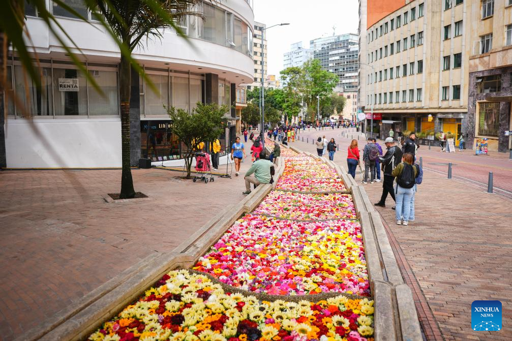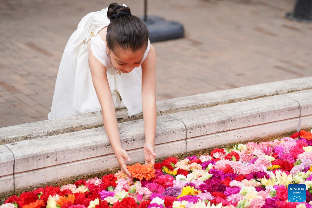 BOGOTA, 20 septiembre, 2025 (Xinhua) -- Una niña coloca una flor en la instalación floral "El Canto del Río" en el marco de la Bienal Internacional de Arte y Ciudad BOG25, en Bogotá, capital de Colombia, el 20 de septiembre de 2025. (Xinhua/Andrés Moreno)