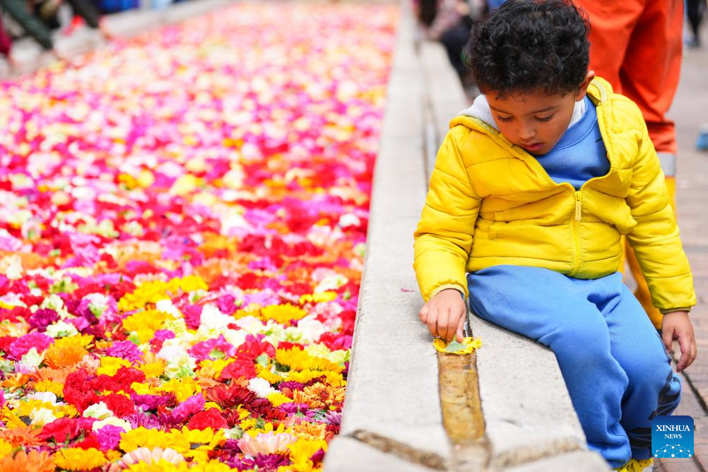 BOGOTA, 20 septiembre, 2025 (Xinhua) -- Un niño coloca una flor en la instalación floral "El Canto del Río" en el marco de la Bienal Internacional de Arte y Ciudad BOG25, en Bogotá, capital de Colombia, el 20 de septiembre de 2025. (Xinhua/Andrés Moreno)