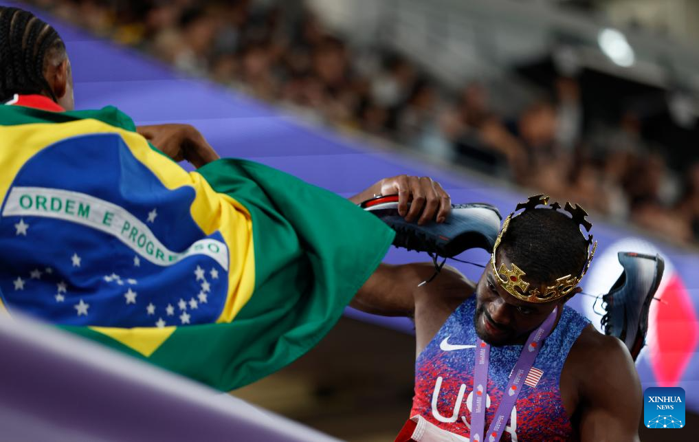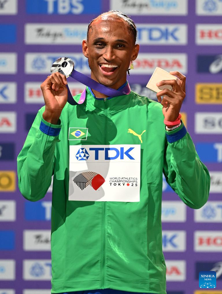 TOKIO, 19 septiembre, 2025 (Xinhua) -- El medallista de plata, Alison Dos Santos, de Brasil, reacciona durante la ceremonia de premiación de los 400m con vallas masculinos, en el Campeonato Mundial de Atletismo 2025, en Tokio, Japón, el 20 de septiembre de 2025. (Xinhua/Jiang Han)