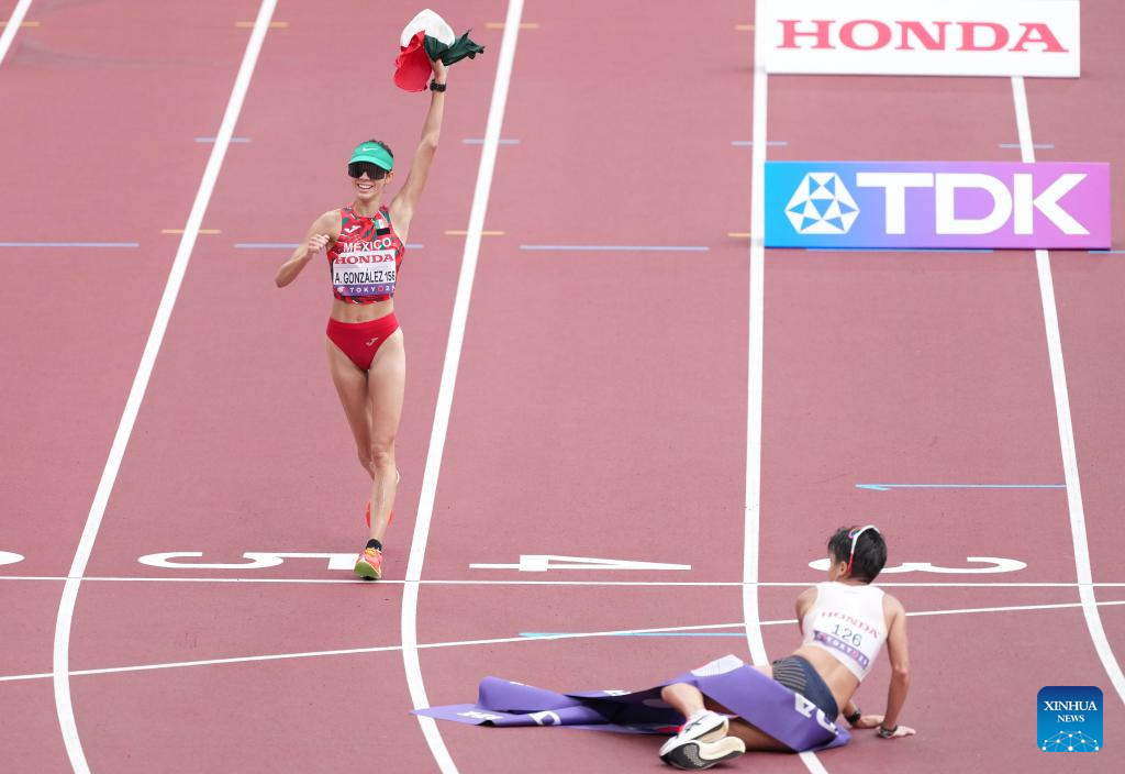 TOKIO, 20 septiembre, 2025 (Xinhua) -- La medallista de plata, Alegna González, de México, festeja al término de la final de 20km de marcha femenina, en el Campeonato Mundial de Atletismo 2025, en Tokio, Japón, el 20 de septiembre de 2025. (Xinhua/Song Yanhua)