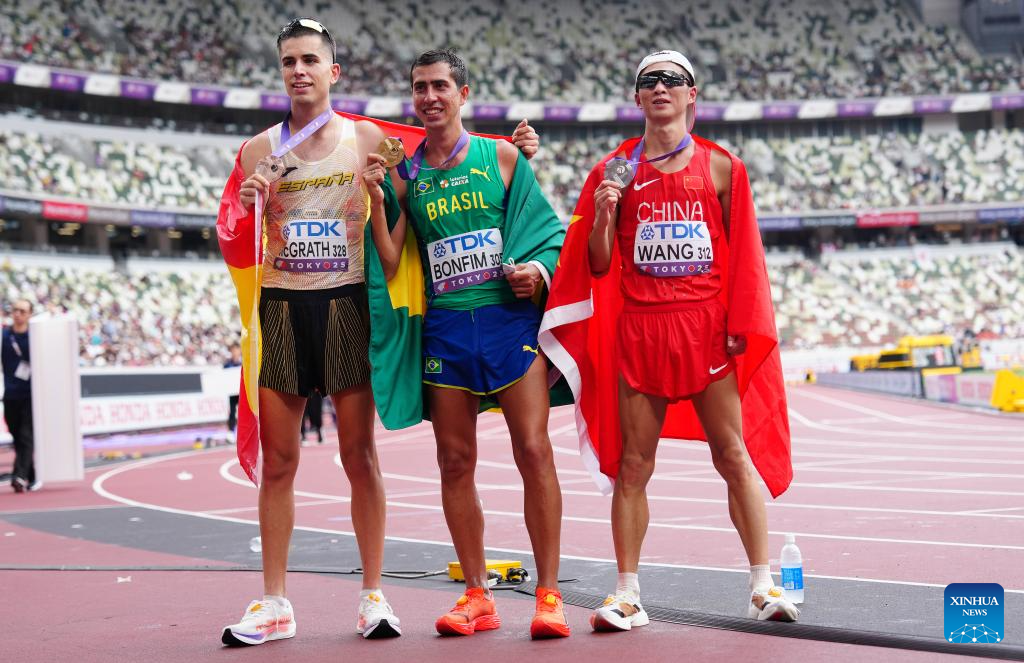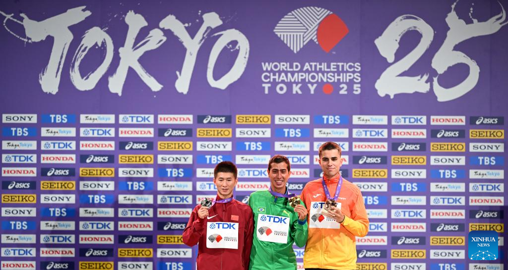 TOKIO, 20 septiembre, 2025 (Xinhua) -- El medallista de oro, Caio Bonfim (c), de Brasil, el medallista de plata, Wang Zhaozhao (i), de China, y el medallista de bronce, Paul McGrath, de España, posan durante la ceremonia de premiación del evento de 20km de marcha masculina, en el Campeonato Mundial de Atletismo 2025, en Tokio, Japón, el 20 de septiembre de 2025. (Xinhua/Jiang Han)