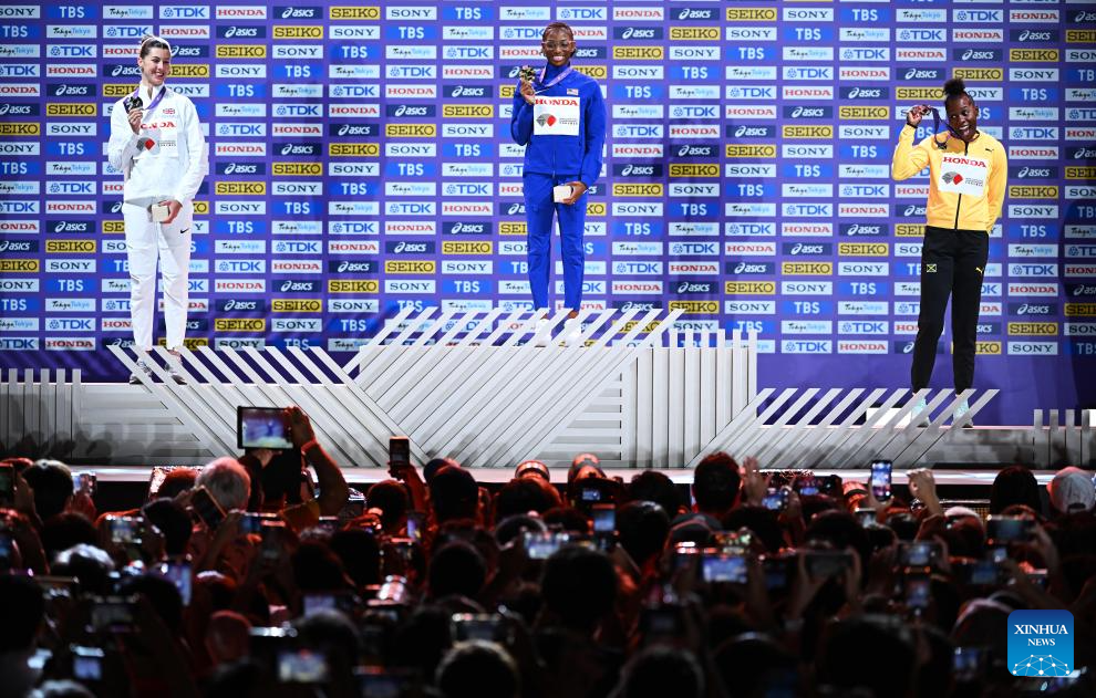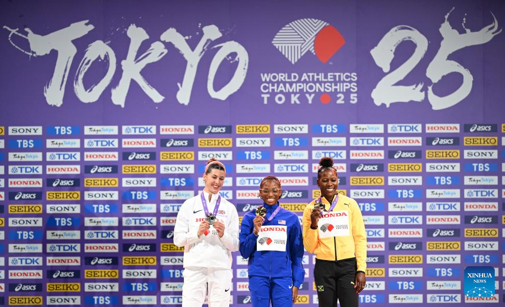 TOKIO, 20 septiembre, 2025 (Xinhua) -- La medallista de oro, Melissa Jefferson-Wooden (c), de Estados Unidos, la medallista de plata, Amy Hunt (i), de Reino Unido, y la medallista de bronce, Shericka Jackson, de Jamaica, posan durante la ceremonia de premiación de los 200m femeninos, en el Campeonato Mundial de Atletismo 2025, en Tokio, Japón, el 20 de septiembre de 2025. (Xinhua/Jiang Han)