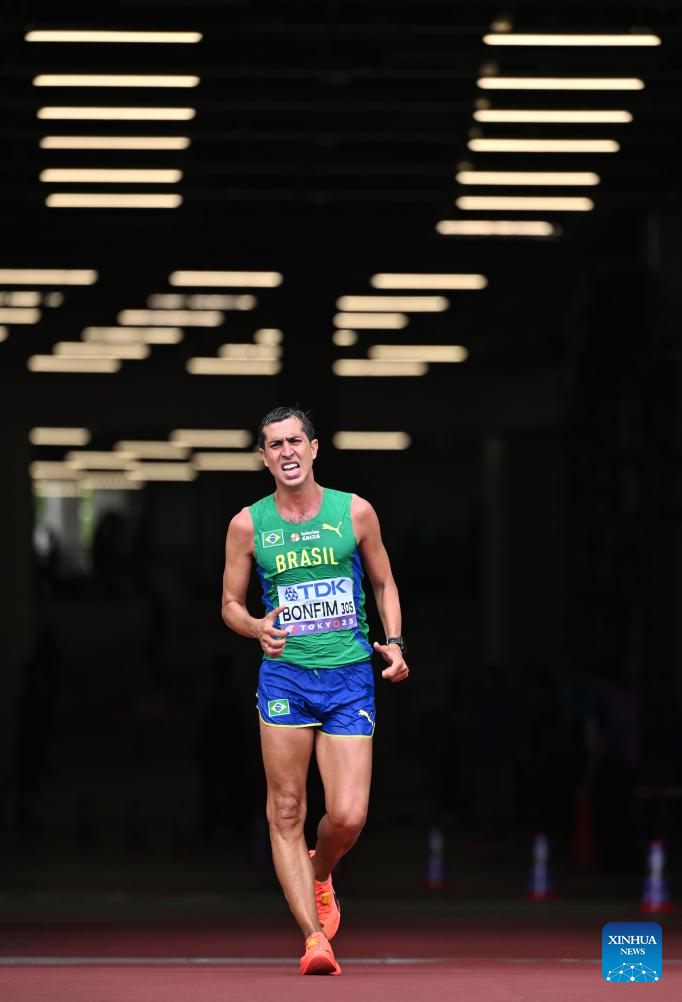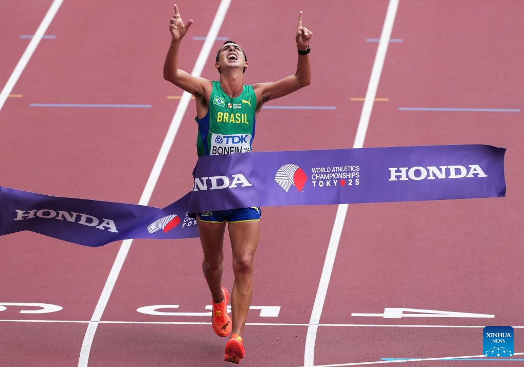 TOKIO, 20 septiembre, 2025 (Xinhua) -- Caio Bonfim, de Brasil, cruza la línea de meta durante la final de 20km de marcha masculina, en el Campeonato Mundial de Atletismo 2025, en Tokio, Japón, el 20 de septiembre de 2025. (Xinhua/Jiang Han)