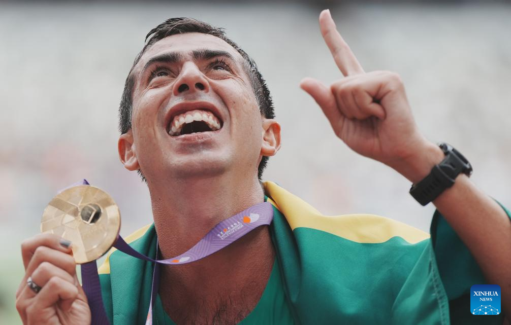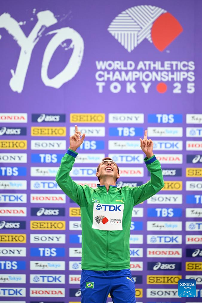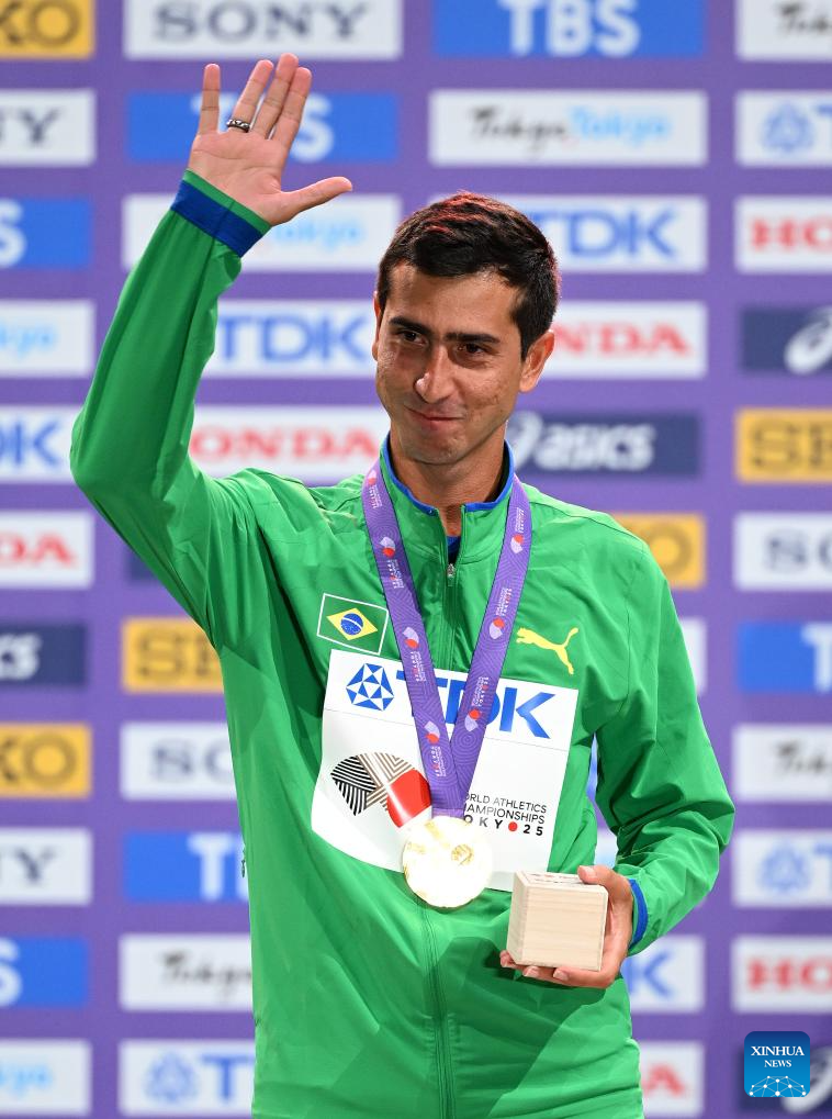 TOKIO, 20 septiembre, 2025 (Xinhua) -- El medallista de oro, Caio Bonfim, de Brasil, reacciona durante la ceremonia de premiación del evento de 20km de marcha masculina, en el Campeonato Mundial de Atletismo 2025, en Tokio, Japón, el 20 de septiembre de 2025. (Xinhua/Jiang Han)