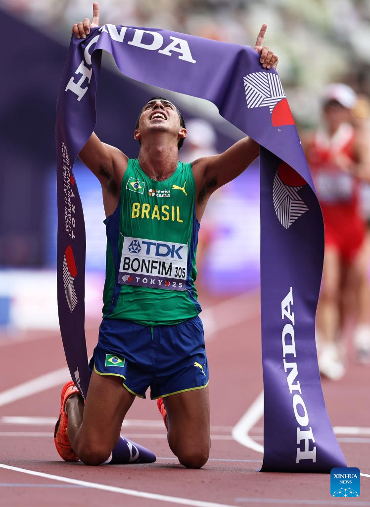 TOKIO, 20 septiembre, 2025 (Xinhua) -- El medallista de oro, Caio Bonfim, de Brasil, reacciona al término de la final de 20km de marcha masculina en el Campeonato Mundial de Atletismo 2025, en Tokio, Japón, el 20 de septiembre de 2025. (Xinhua/Song Yanhua)