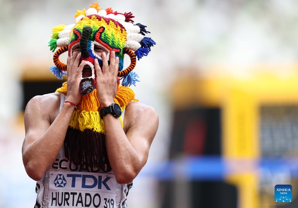TOKIO, 20 septiembre, 2025 (Xinhua) -- David Hurtado, de Ecuador, reacciona al término de la final de 20km de marcha masculina, en el Campeonato Mundial de Atletismo 2025, en Tokio, Japón, el 20 de septiembre de 2025. (Xinhua/Jia Haocheng)