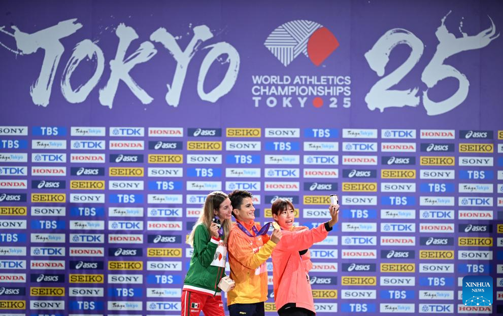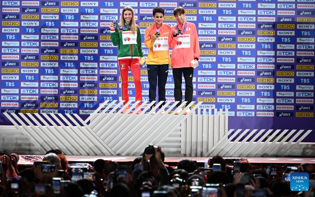TOKIO, 20 septiembre, 2025 (Xinhua) -- La medallista de oro, María Pérez (c), de España, la medallista de plata, Alegna González (i), de México, y la medallista de bronce, Fujii Nanako, de Japón, posan para fotografías durante la ceremonia de premiación del evento de 20km de marcha femenina, en el Campeonato Mundial de Atletismo 2025, en Tokio, Japón, el 20 de septiembre de 2025. (Xinhua/Jiang Han)