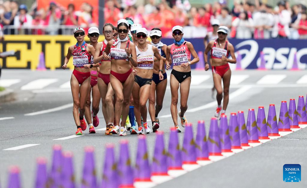 TOKIO, 20 septiembre, 2025 (Xinhua) -- Alegna González (i), de México, María Pérez (3-d), de España, y Nanako Fujii (d), de Japón, compiten durante la final de 20km de marcha femenina, en el Campeonato Mundial de Atletismo 2025, en Tokio, Japón, el 20 de septiembre de 2025. (Xinhua/Ju Huanzong)