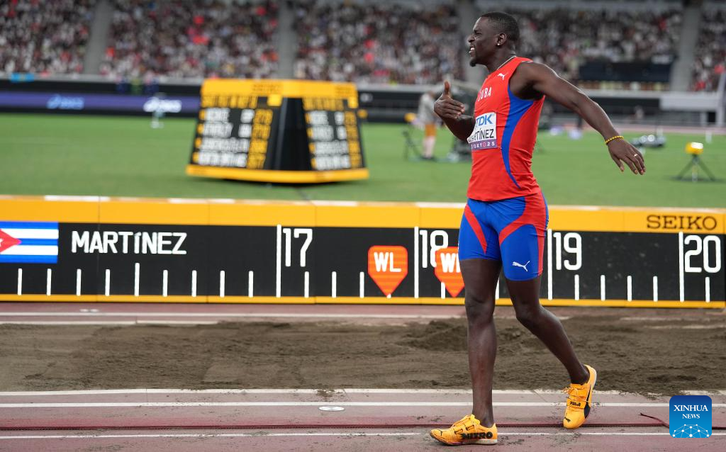 TOKIO, 20 septiembre, 2025 (Xinhua) -- Imagen del 19 de septiembre de 2025 de Lázaro Martínez, de Cuba, reaccionando durante la final de salto triple masculino, en el Campeonato Mundial de Atletismo 2025, en Tokio, Japón. (Xinhua/Ju Huanzong)
