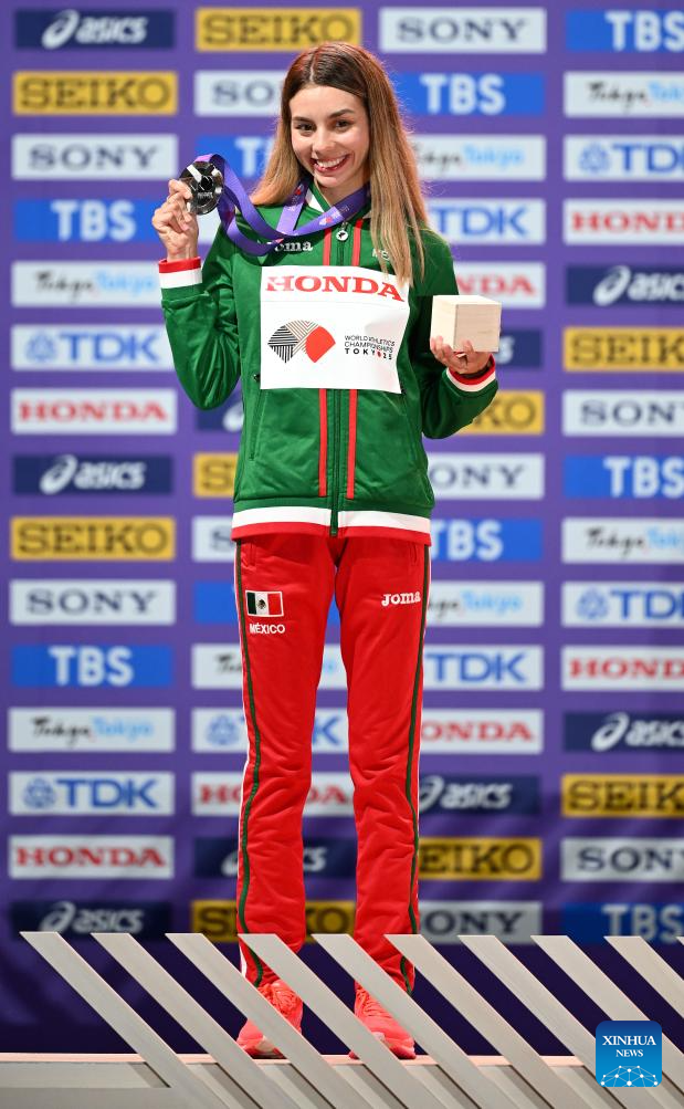 TOKIO, 20 septiembre, 2025 (Xinhua) -- La medallista de plata, Alegna González, de México, posa durante la ceremonia de premiación del evento de 20km de marcha femenina, en el Campeonato Mundial de Atletismo 2025, en Tokio, Japón, el 20 de septiembre de 2025. (Xinhua/Jiang Han)