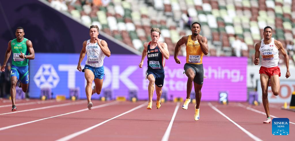 TOKIO, 20 septiembre, 2025 (Xinhua) -- (De izq. a der.) José Fernando Ferreira, de Brasil, Vilem Strasky, de República Checa, Sander Skotheim, de Noruega, Leo Neugebauer, de Alemania, y Pierce Lepage, de Canadá, compiten durante la prueba de 100m del decatlón masculino, en el Campeonato Mundial de Atletismo 2025, en Tokio, Japón, el 20 de septiembre de 2025. (Xinhua/Jia Haocheng)