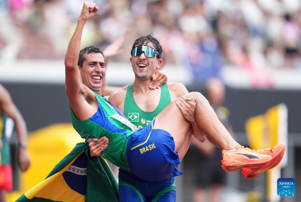 TOKIO, 20 septiembre, 2025 (Xinhua) -- El medallista de oro, Caio Bonfim, de Brasil, es cargado por su compañero de equipo, Matheus Correa, al término de la final de 20km de marcha masculina, en el Campeonato Mundial de Atletismo 2025, en Tokio, Japón, el 20 de septiembre de 2025. (Xinhua/Lui Siu Wai)