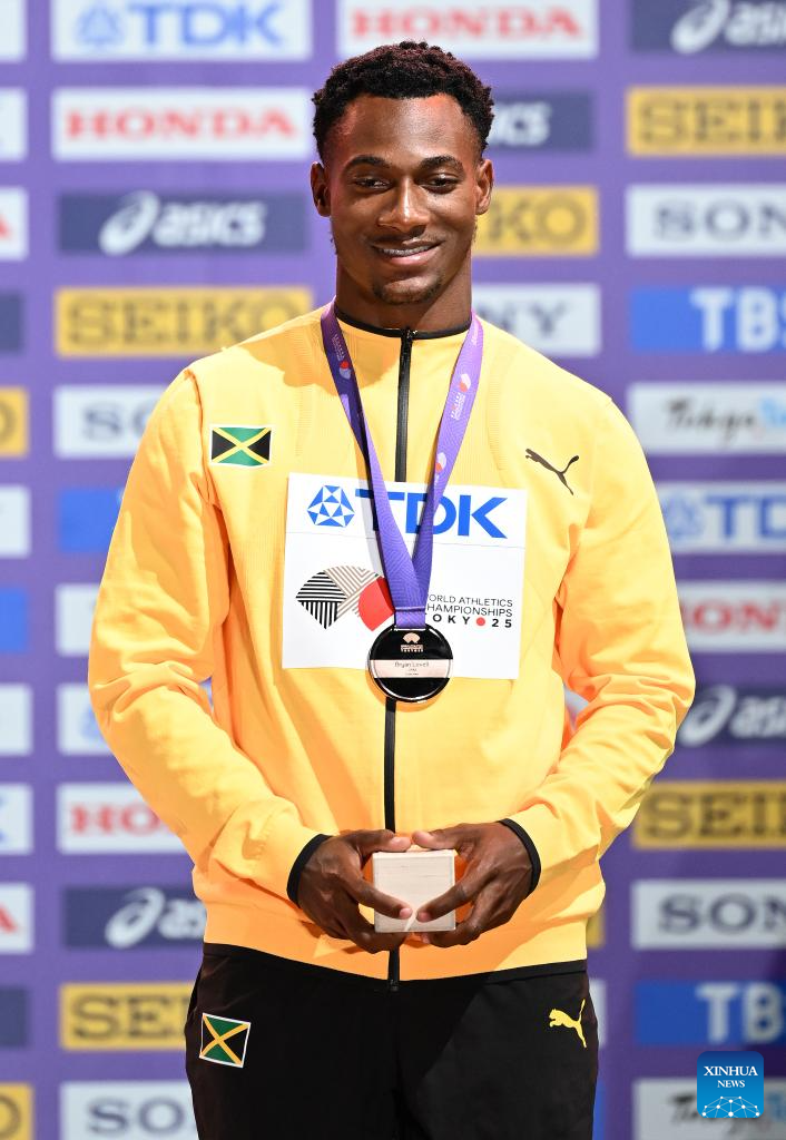 TOKIO, 20 septiembre, 2025 (Xinhua) -- El medallista de bronce, Bryan Levell, de Jamaica, reacciona durante la ceremonia de premiación de los 200m masculinos, en el Campeonato Mundial de Atletismo 2025, en Tokio, Japón, el 20 de septiembre de 2025. (Xinhua/Jiang Han)