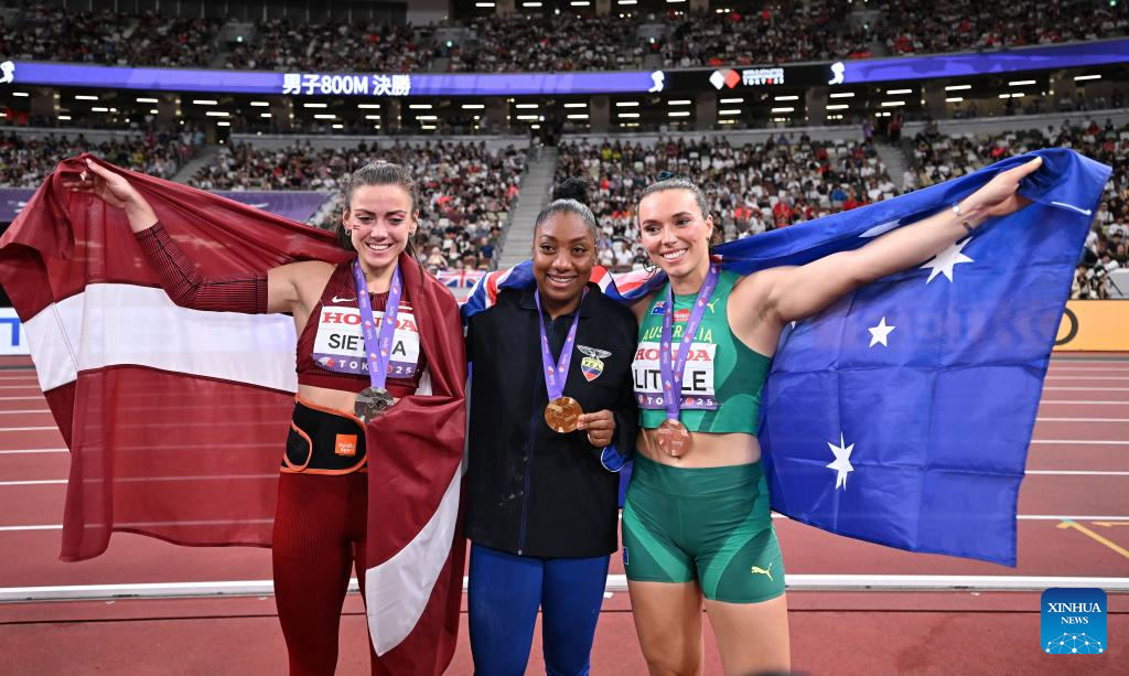 TOKIO, 20 septiembre, 2025 (Xinhua) -- Juleisy Angulo (c), de Ecuador, Anete Sietina (i), de Letonia, y Mackenzie Little, de Australia, posan para fotografías al término de la final de lanzamiento de jabalina femenino, en el Campeonato Mundial de Atletismo 2025, en Tokio, Japón, el 20 de septiembre de 2025. (Xinhua/Song Yanhua)
