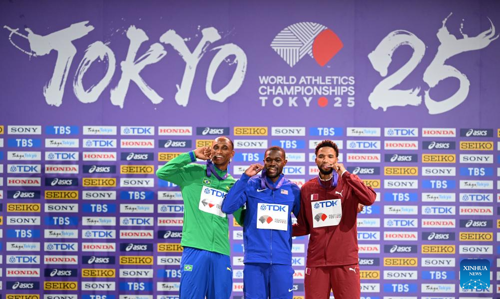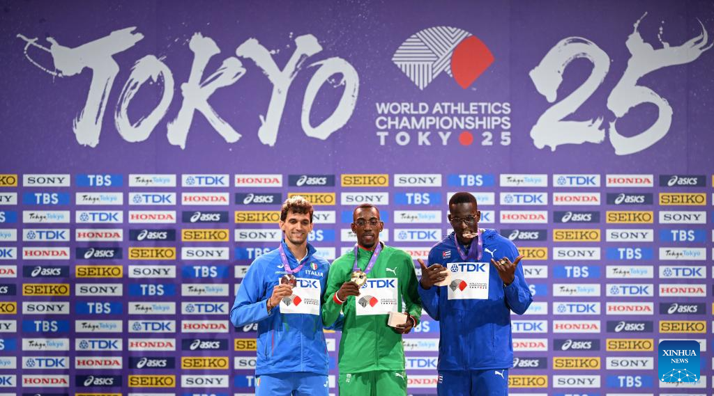 TOKIO, 20 septiembre, 2025 (Xinhua) -- El medallista de oro, Pedro Pichardo (c), de Portugal, el medallista de plata, Andrea Dallavalle (i), de Italia, y el medallista de bronce, Lázaro Martínez, de Cuba, posan durante la ceremonia de premiación de salto triple masculino, en el Campeonato Mundial de Atletismo 2025, en Tokio, Japón, el 20 de septiembre de 2025. (Xinhua/Jiang Han)