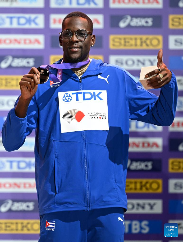 TOKIO, 20 septiembre, 2025 (Xinhua) -- El medallista de bronce, Lázaro Martínez, de Cuba, reacciona durante la ceremonia de premiación de salto triple masculino, en el Campeonato Mundial de Atletismo 2025, en Tokio, Japón, el 20 de septiembre de 2025. (Xinhua/Jiang Han)