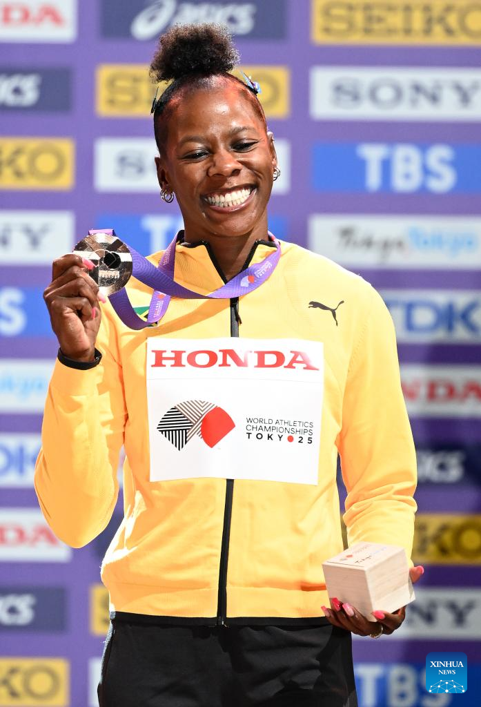 TOKIO, 20 septiembre, 2025 (Xinhua) -- La medallista de bronce, Shericka Jackson, de Jamaica, posa durante la ceremonia de premiación de los 200m femeninos, en el Campeonato Mundial de Atletismo 2025, en Tokio, Japón, el 20 de septiembre de 2025. (Xinhua/Jiang Han)