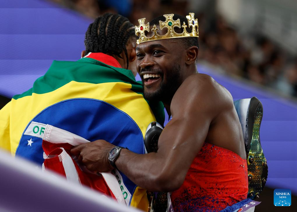 TOKIO, 19 septiembre, 2025 (Xinhua) -- Imagen del 19 de septiembre de 2025 del medallista de oro, Rai Benjamin (d), de Estados Unidos, y el medallista de plata, Alison Dos Santos, de Brasil, vistos al término de la final de los 400m con vallas masculinos, en el Campeonato Mundial de Atletismo 2025, en Tokio, Japón. (Xinhua/Wang Lili)