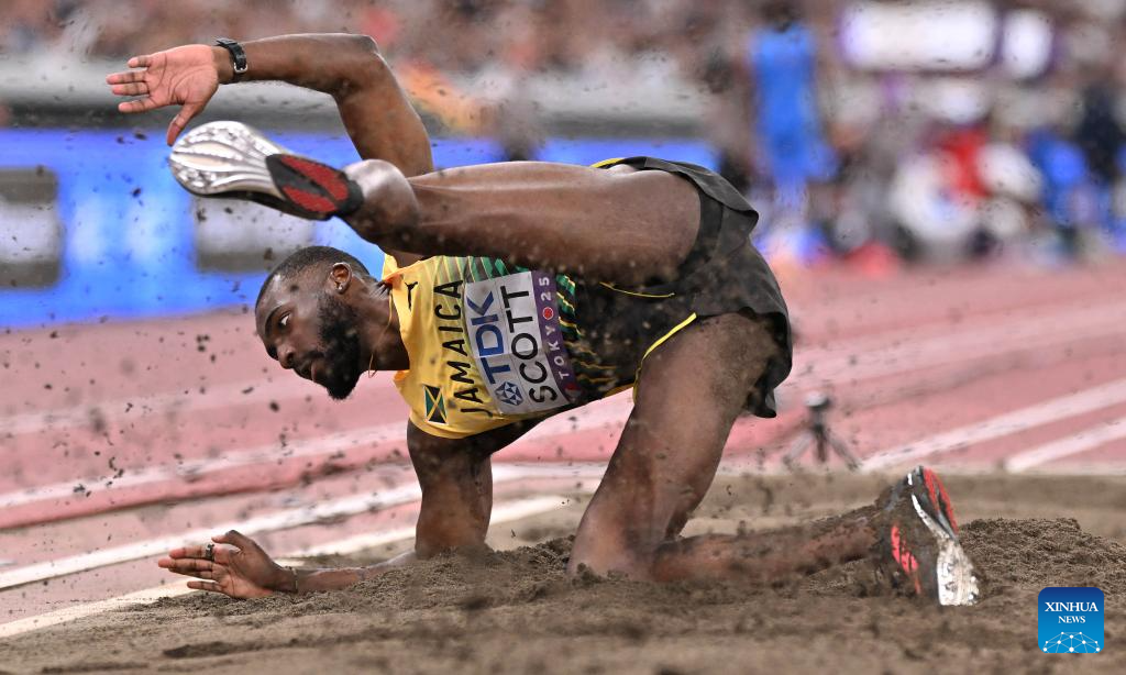 TOKIO, 20 septiembre, 2025 (Xinhua) -- Imagen del 19 de septiembre de 2025 de Jordan Scott, de Jamaica, compitiendo durante la final de salto triple masculino, en el Campeonato Mundial de Atletismo 2025, en Tokio, Japón. (Xinhua/Song Yanhua)