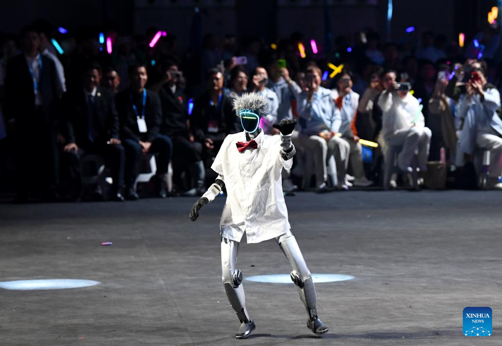 ZHENGZHOU, 20 septiembre, 2025 (Xinhua) -- Imagen del 19 de septiembre de 2025 de un robot realizando una presentación en la ceremonia de inauguración del tercer Concurso de Habilidades Vocacionales, en Zhengzhou, en la provincia de Henan, en el centro de China. El concurso consta de 106 eventos, con la participación de un total de 3.420 competidores de toda China. (Xinhua/Hao Yuan)