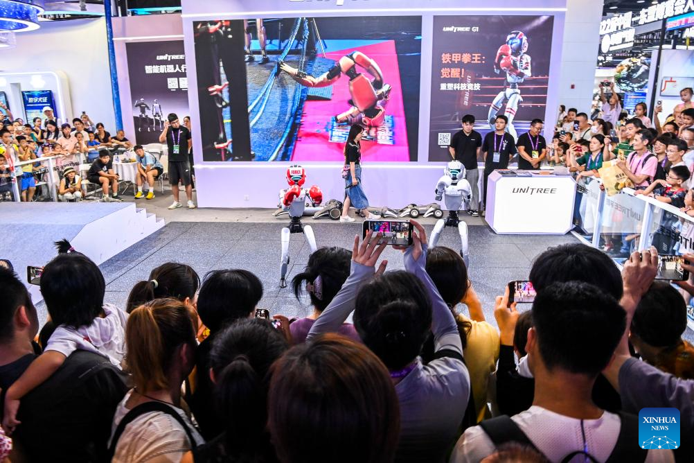 NANNING, 20 septiembre, 2025 (Xinhua) -- Visitantes observan una presentación de robots durante la 22ª Exposición China-ASEAN, en Nanning, en la región autónoma de la etnia zhuang de Guangxi, en el sur de China, el 20 de septiembre de 2025. La exposición abrió sus puertas al público el sábado. (Xinhua/Cao Yiming)