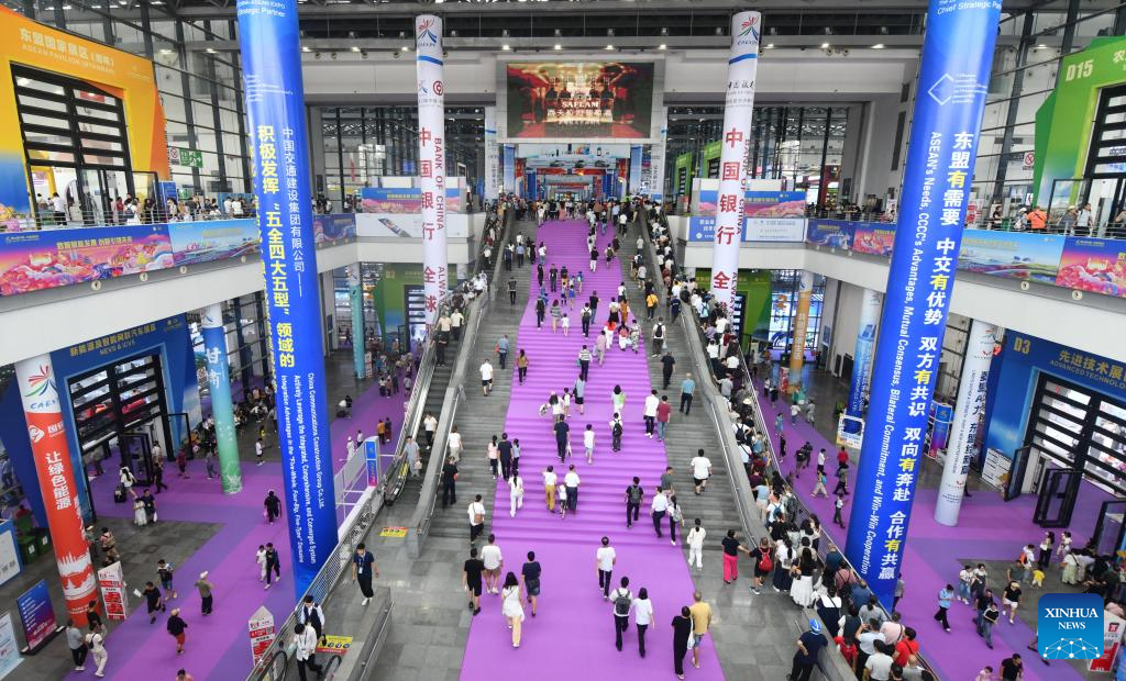 NANNING, 20 septiembre, 2025 (Xinhua) -- Personas visitan la 22ª Exposición China-ASEAN, en Nanning, en la región autónoma de la etnia zhuang de Guangxi, en el sur de China, el 20 de septiembre de 2025. La exposición abrió sus puertas al público el sábado. (Xinhua/Hu Qiusi)