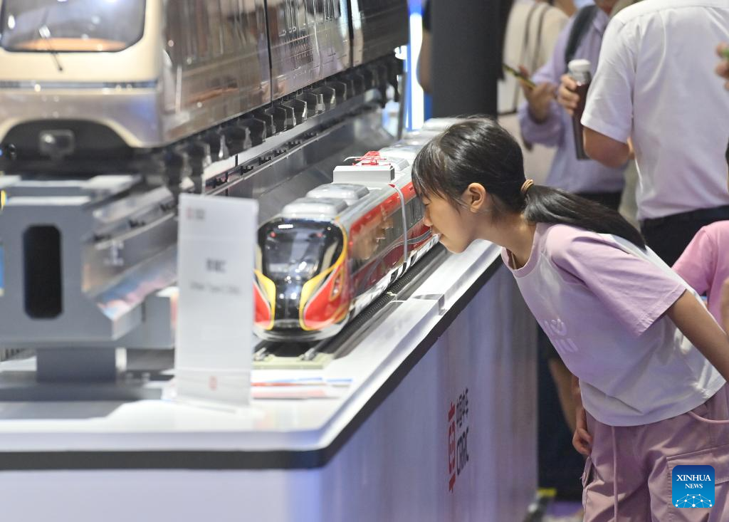 NANNING, 20 septiembre, 2025 (Xinhua) -- Una niña observa una maqueta de un tren de Unidad Múltiple Eléctrica durante la 22ª Exposición China-ASEAN, en Nanning, en la región autónoma de la etnia zhuang de Guangxi, en el sur de China, el 20 de septiembre de 2025. La exposición abrió sus puertas al público el sábado. (Xinhua/Huang Xiaobang)