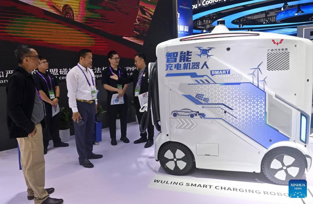 ANNING, 20 septiembre, 2025 (Xinhua) -- Imagen del 19 de septiembre de 2025 de personas observando un robot de carga inteligente durante la 22ª Exposición China-ASEAN, en Nanning, en la región autónoma de la etnia zhuang de Guangxi, en el sur de China. En la 22ª Exposición China-ASEAN en curso, los vehículos de nueva energía producidos en Liuzhou de Guangxi, y potenciados con inteligencia artificial atraen amplia atención tanto de empresas como de visitantes nacionales y extranjeros. (Xinhua/Lu Boan)