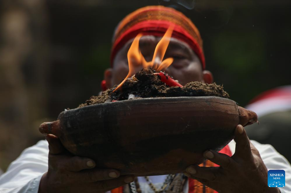 SANTA ANA, 21 septiembre, 2025 (Xinhua) -- Un hombre levanta un recipiente de incienso, durante una ceremonia maya en celebración por el equinoccio de otoño, en el Parque Arqueológico Tazumal, en el municipio de Chalchuapa, en el departamento de Santa Ana, El Salvador, el 21 de septiembre de 2025. (Xinhua/Alexander Peña)