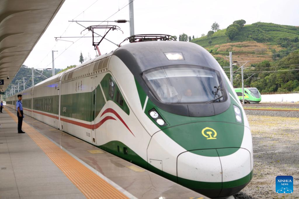 PU'ER, 21 septiembre, 2025 (Xinhua) -- Imagen del 20 de septiembre de 2025 de un tren llegando a la Estación de Ferrocarriles de Pu'er, en la ciudad de Pu'er, en la provincia de Yunnan, en el suroeste de China. Hasta el 20 de septiembre, el ferrocarril China-Laos ha transportado a más de 59 millones de pasajeros desde su inauguración en diciembre de 2021, de acuerdo con China Railway Kunming Group Co., Ltd. (Xinhua/Xing Guangli)