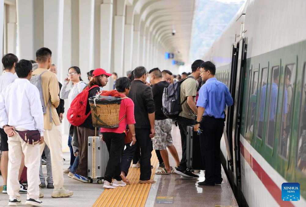 PU'ER, 21 septiembre, 2025 (Xinhua) -- Imagen del 20 de septiembre de 2025 de pasajeros abordando un tren en la Estación de Ferrocarriles de Pu'er, en la ciudad de Pu'er, en la provincia de Yunnan, en el suroeste de China. Hasta el 20 de septiembre, el ferrocarril China-Laos ha transportado a más de 59 millones de pasajeros desde su inauguración en diciembre de 2021, de acuerdo con China Railway Kunming Group Co., Ltd. (Xinhua/Xing Guangli)