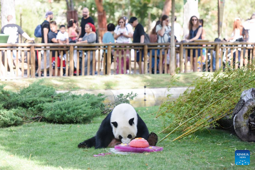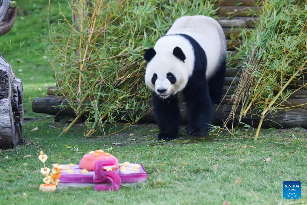 MADRID, 21 septiembre, 2025 (Xinhua) -- Imagen del 20 de septiembre de 2025 del panda gigante Jin Xi acercándose a su almuerzo de cumpleaños en el Zoo Aquarium de Madrid, en Madrid, España. El zoológico celebró el sábado una serie de actividades culturales y educativas, entre ellas presentaciones acrobáticas, para celebrar el quinto cumpleaños de dos pandas gigantes. El macho Jin Xi y la hembra Zhu Yu, ambos nacidos en 2020, llegaron al zoológico el 29 de abril del año pasado. (Xinhua/Gustavo Valiente)