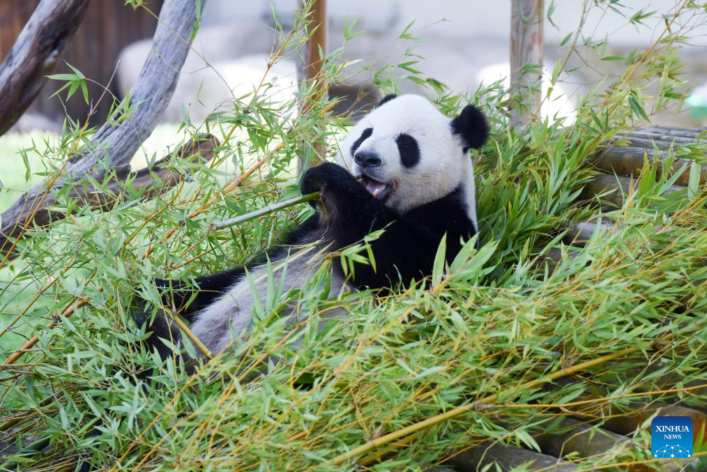 MADRID, 21 septiembre, 2025 (Xinhua) -- Imagen del 20 de septiembre de 2025 del panda gigante Jin Xi alimentándose de bambú en el Zoo Aquarium de Madrid, en Madrid, España. El zoológico celebró el sábado una serie de actividades culturales y educativas, entre ellas presentaciones acrobáticas, para celebrar el quinto cumpleaños de dos pandas gigantes. El macho Jin Xi y la hembra Zhu Yu, ambos nacidos en 2020, llegaron al zoológico el 29 de abril del año pasado. (Xinhua/Gustavo Valiente)