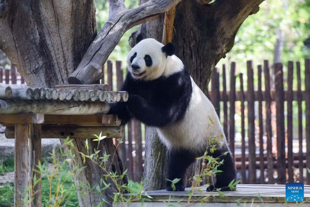 MADRID, 21 septiembre, 2025 (Xinhua) -- Imagen del 20 de septiembre de 2025 del panda gigante Jin Xi jugando en el Zoo Aquarium de Madrid, en Madrid, España. El zoológico celebró el sábado una serie de actividades culturales y educativas, entre ellas presentaciones acrobáticas, para celebrar el quinto cumpleaños de dos pandas gigantes. El macho Jin Xi y la hembra Zhu Yu, ambos nacidos en 2020, llegaron al zoológico el 29 de abril del año pasado. (Xinhua/Gustavo Valiente)