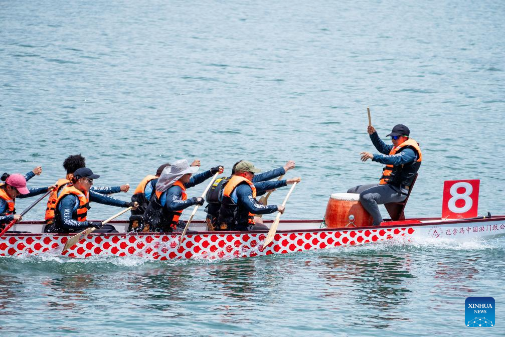 CIUDAD DE PANAMA, 22 septiembre, 2025 (Xinhua) -- Imagen del 21 de septiembre de 2025 de un equipo compitiendo en la Carrera de Botes de Dragón, en la Ciudad de Panamá, capital de Panamá. Los panameños realizaron el fin de semana una carrera de botes de dragón en la Ciudad de Panamá para celebrar el 76° aniversario de la fundación de la República Popular China. (Xinhua/Xu Yongzheng)